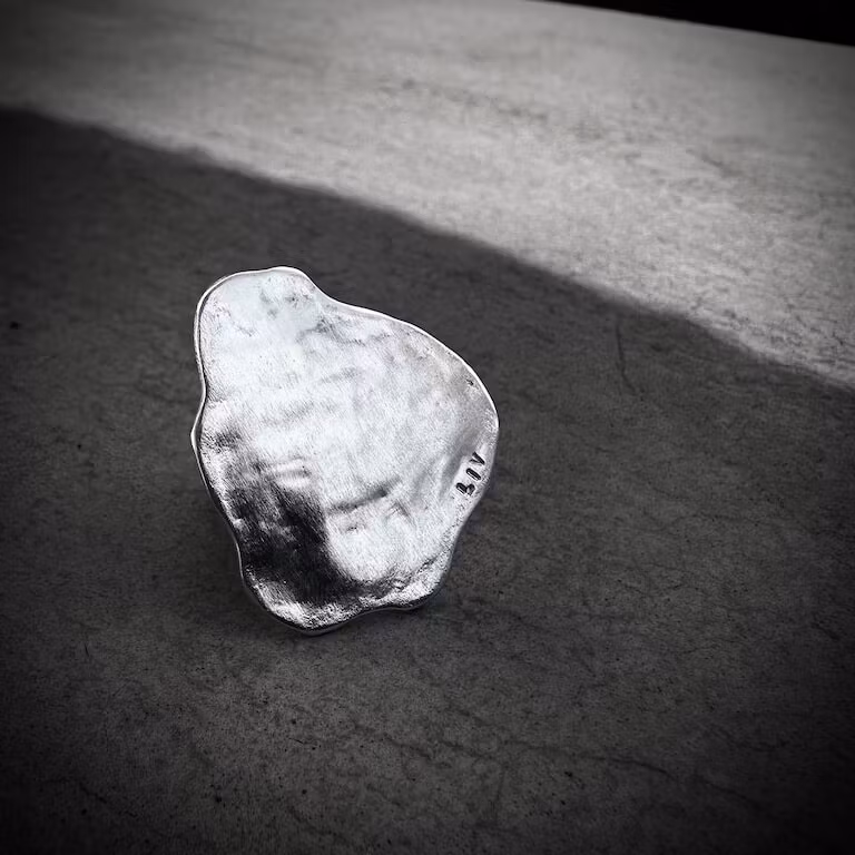 Öppen justerbar silverring i organisk form med rå yta.